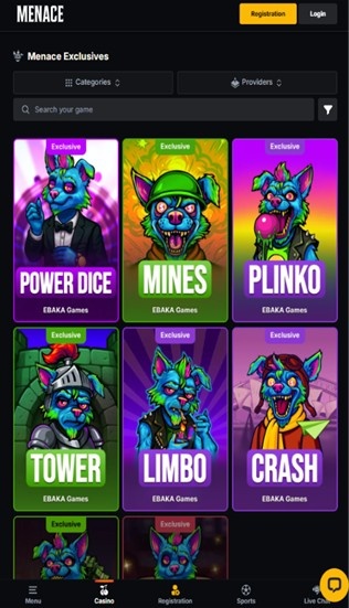 Menace Casino features a specialized “Menace Originals” section, offering a selection of exclusive titles that provide a distinct break from traditional slot mechanics. These games are built by EBAKA Games with a focus on high-speed gameplay and minimalist design, catering specifically to players who enjoy instant-win scenarios.