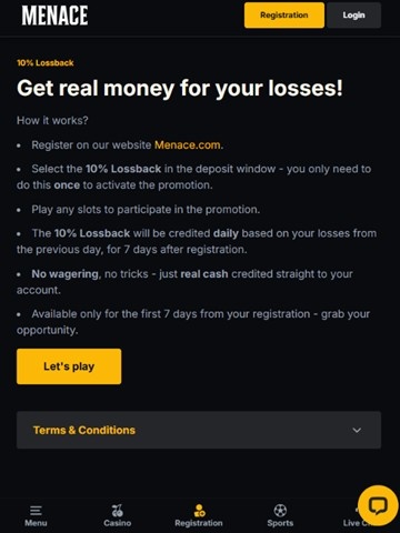 What makes the Menace Casino 10% Lossback welcome bonus good is that it’s generous, especially for those who prefer recouping losses rather than a one-time fixed payout. Unlike many new casinos we recommend offering only a single deposit bonus, this offer grants daily Lossback for up to 7 days from registration. The maximum Lossback amount you can get is also much higher than what you’d find with most standard online casino bonuses not focused on percentage-based bonus payouts.